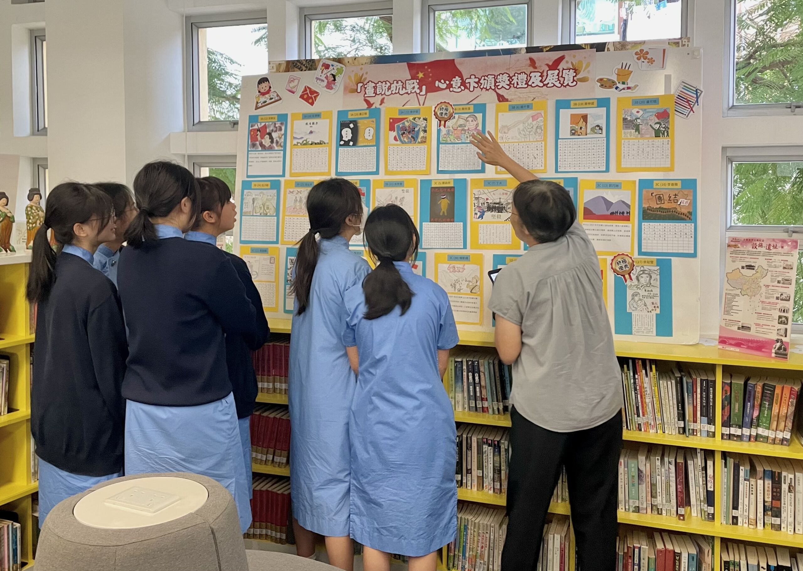 此外,中三級同學在暑假時繪畫了「畫說抗戰」心意卡,表達了她們對抗日戰爭的反思和感受。同學們十分用心繪畫作品,其中二十五份佳作亦同樣展示在圖書館讓同學欣賞,並於九月十八日舉行頒獎禮表揚二十五名同學。本校同學閱讀展板和心意卡後,反省戰爭帶來的痛苦,並在便條紙上寫下了她們的感受和想法。