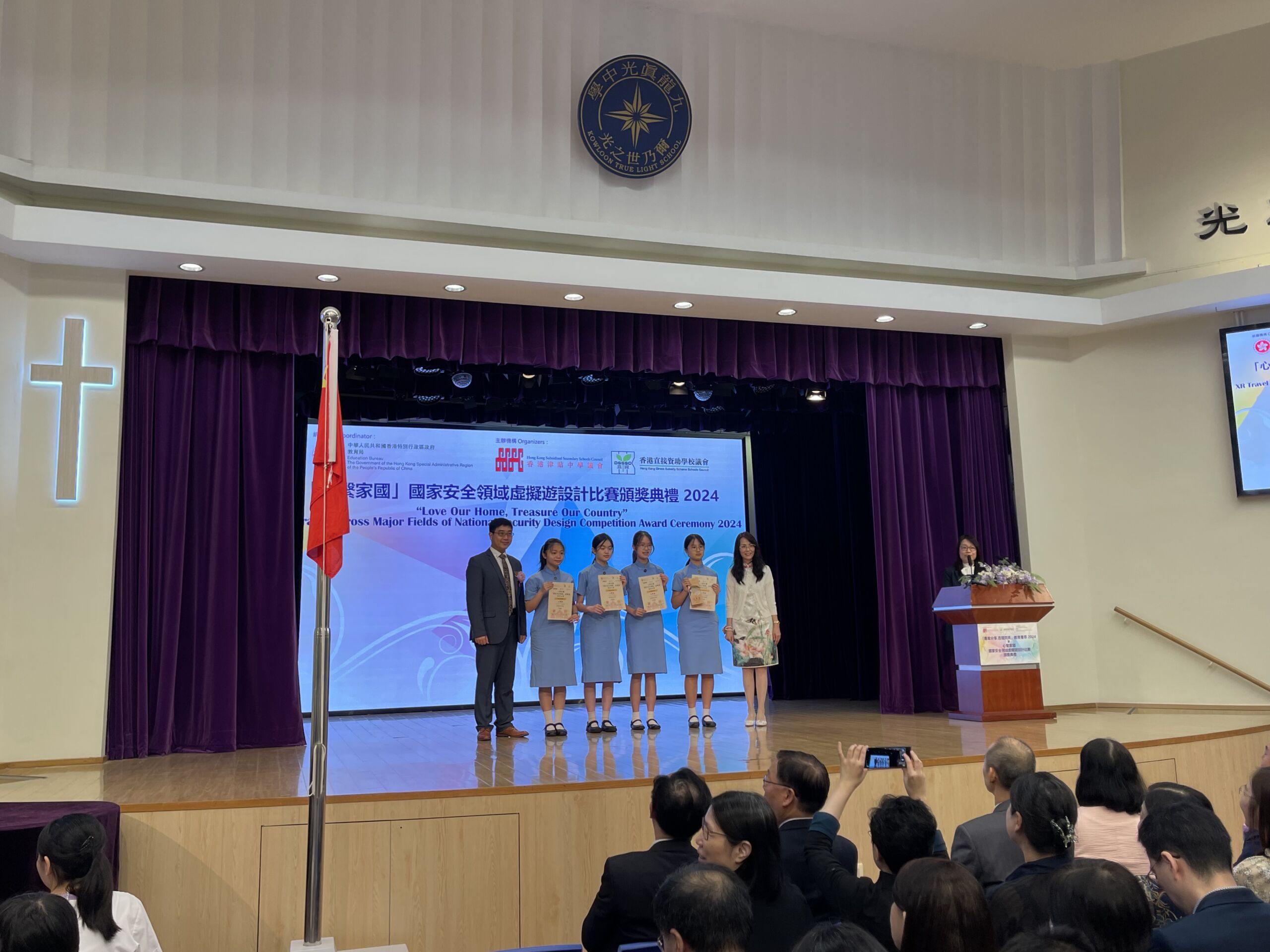 We are proud to announce that a team of four Form 2C students (Yu Sze Wing, Ting Ching Yan, Ng Yuen Tou, Wong Hau Ching) from our school recently won the second runner-up award in the “XR Travel across Major Fields of National Security” Design Competition (「國家安全領域」虛擬遊設計比賽). This competition is one of the “Love Our Home, Treasure Our Country” (「心繫家國」) joint-school activities, organized by the Education Bureau in collaboration with the Hong Kong Subsidized Secondary Schools Council and the Hong Kong Direct Subsidy Scheme Schools Council. It aims to promote national security education among students and encourage the use of virtual reality (VR) and augmented reality (AR) technologies.