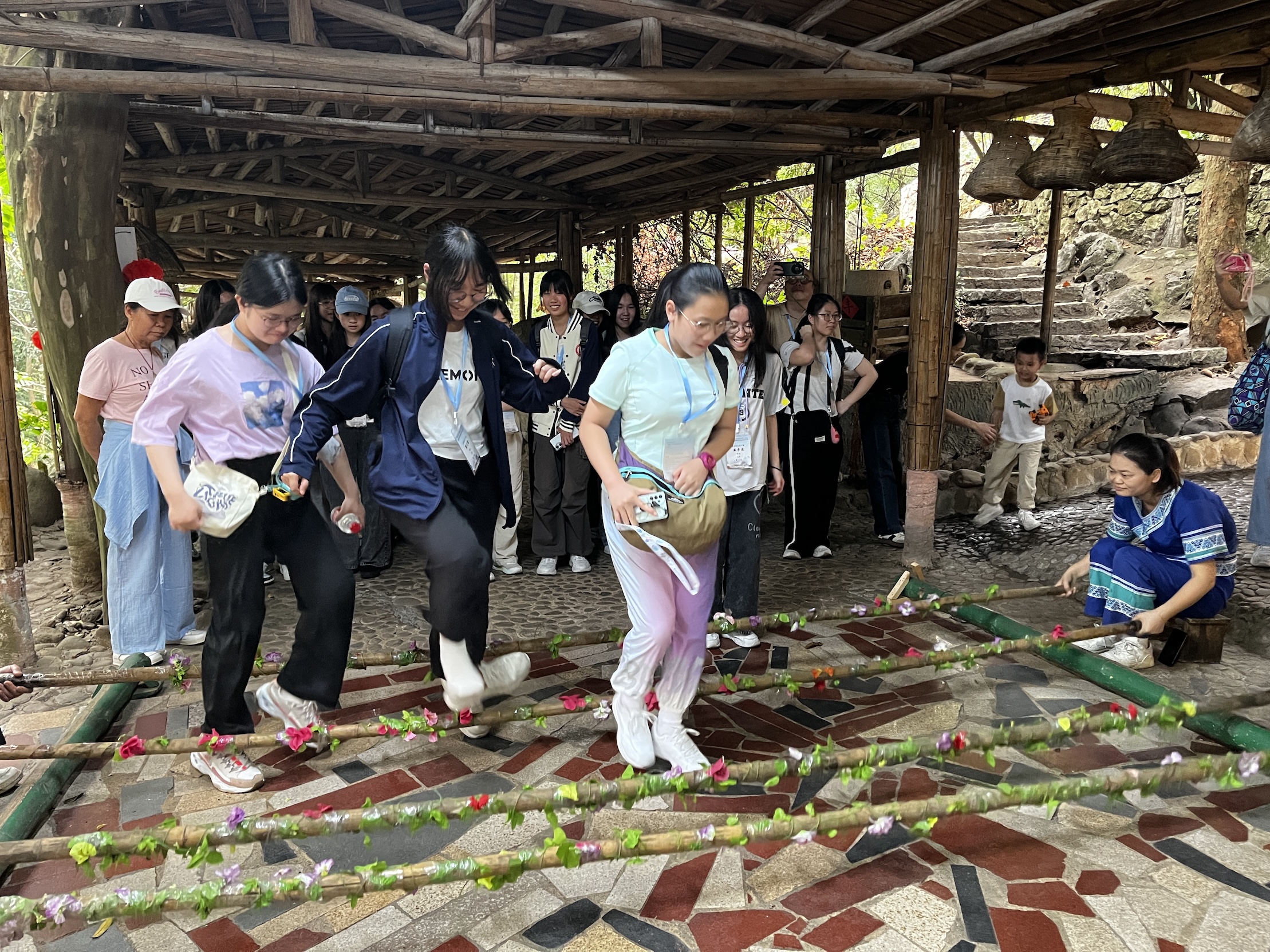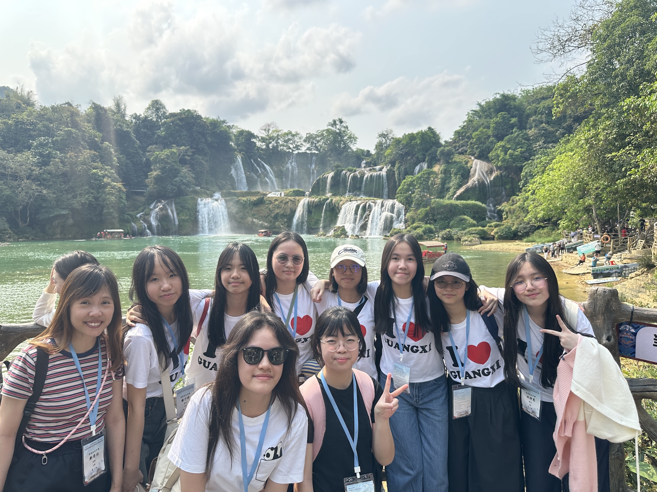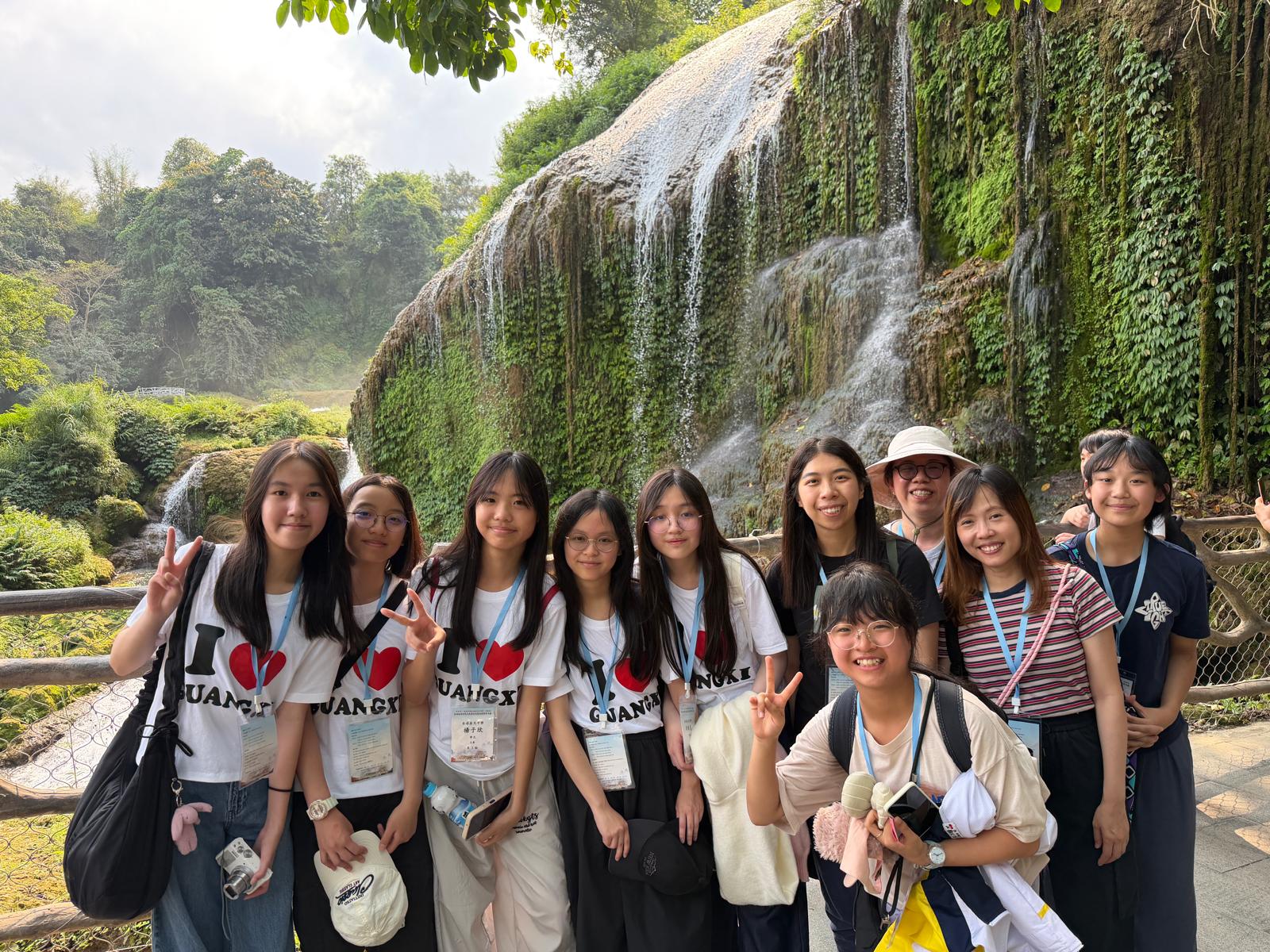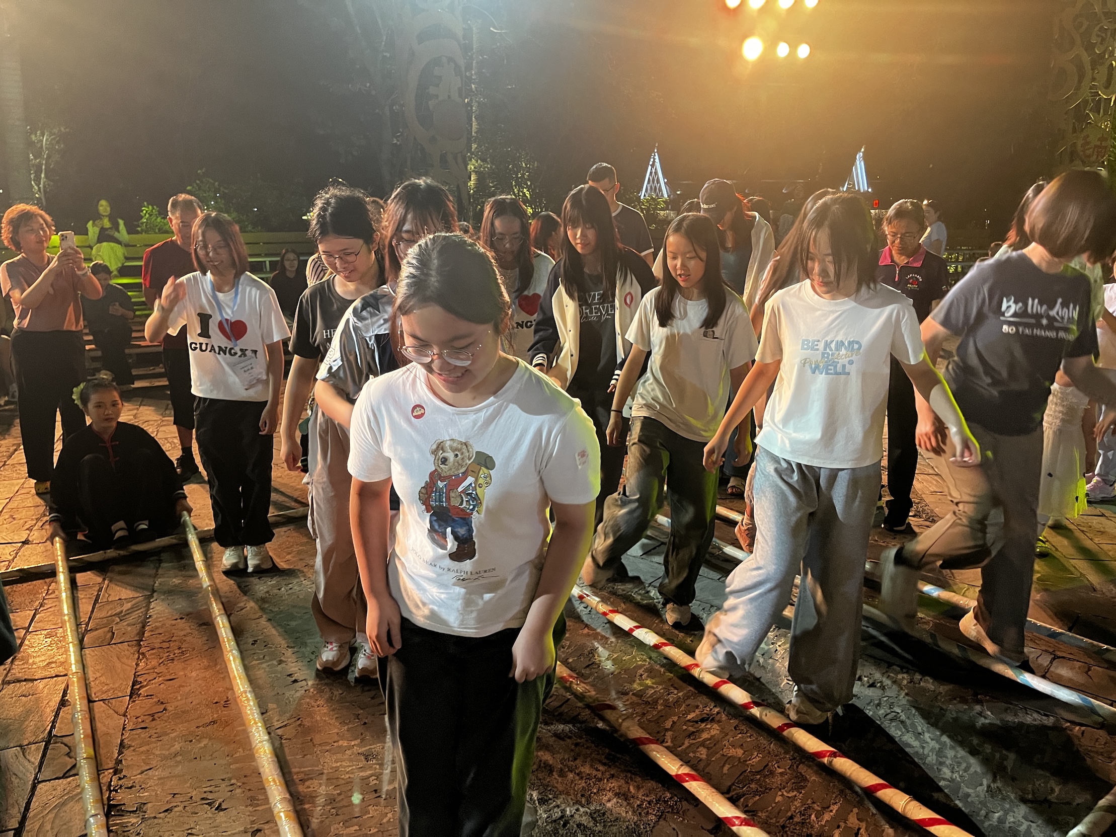 行程第三天,同學們來到「明仕田園」,乘坐傳統竹筏穿梭於翠竹繞岸的碧波之上,飽覽如詩如畫的「小桂林」山水景色,在悠然的氛圍中領悟人與自然和諧共生的意義。接著,我們前往橫跨中越兩國的「德天跨國大瀑布」。站在氣勢磅礴的瀑布前,同學們不僅被壯麗的自然景觀所震撼,更深入了解到跨境河流的地貌特徵以及國家在邊陲地區的環境保護責任。當晚,旅程迎來了溫馨而熱鬧的時刻——篝火晚會。同學們與當地民族同胞載歌載舞,在歡笑聲中深化了對民族融合的體會,也增進了師生間的情誼。這四天的旅程結合了自然科學與人文學習,不僅開闊了同學的視野,更增強了大家對守護國家文化與生態資源的責任感。